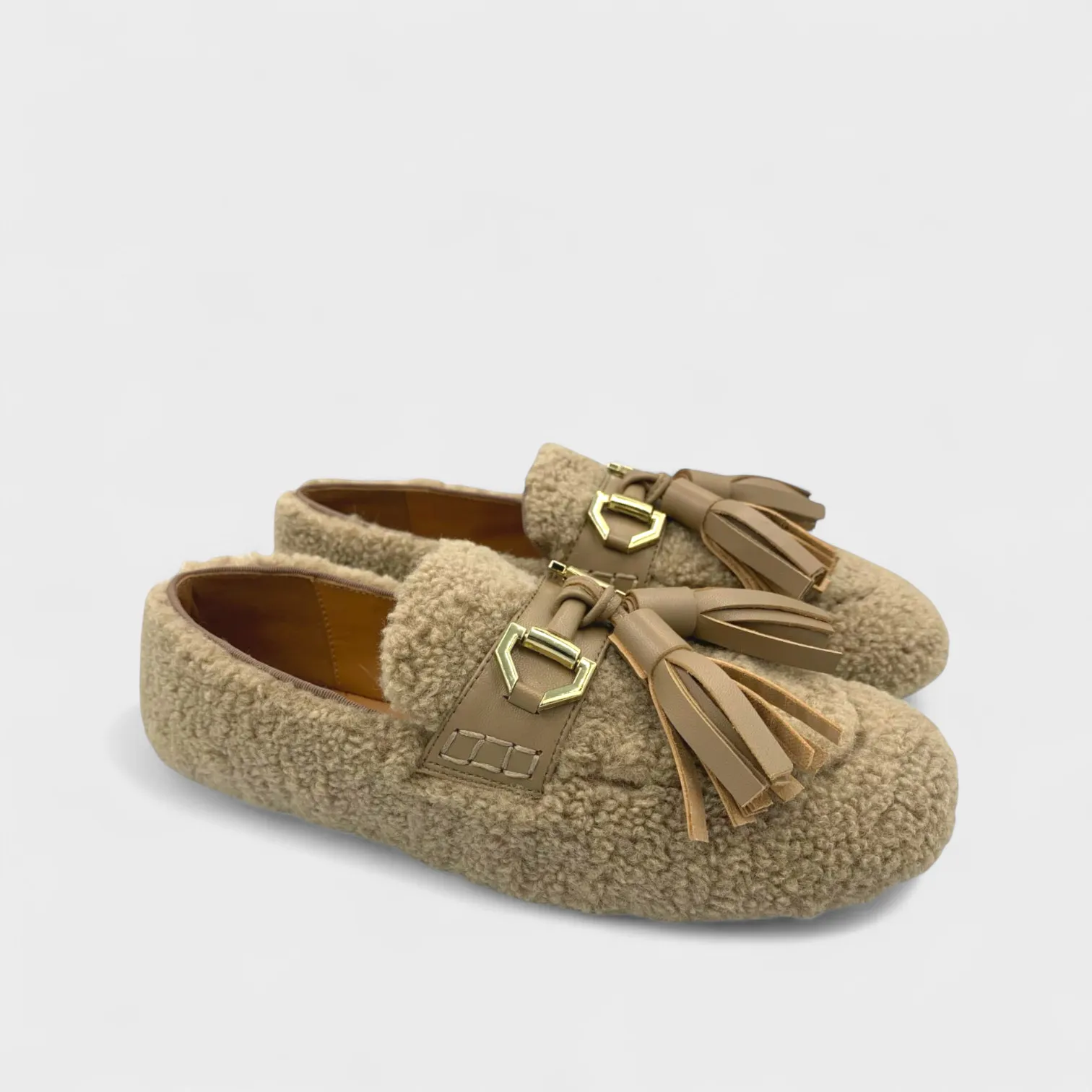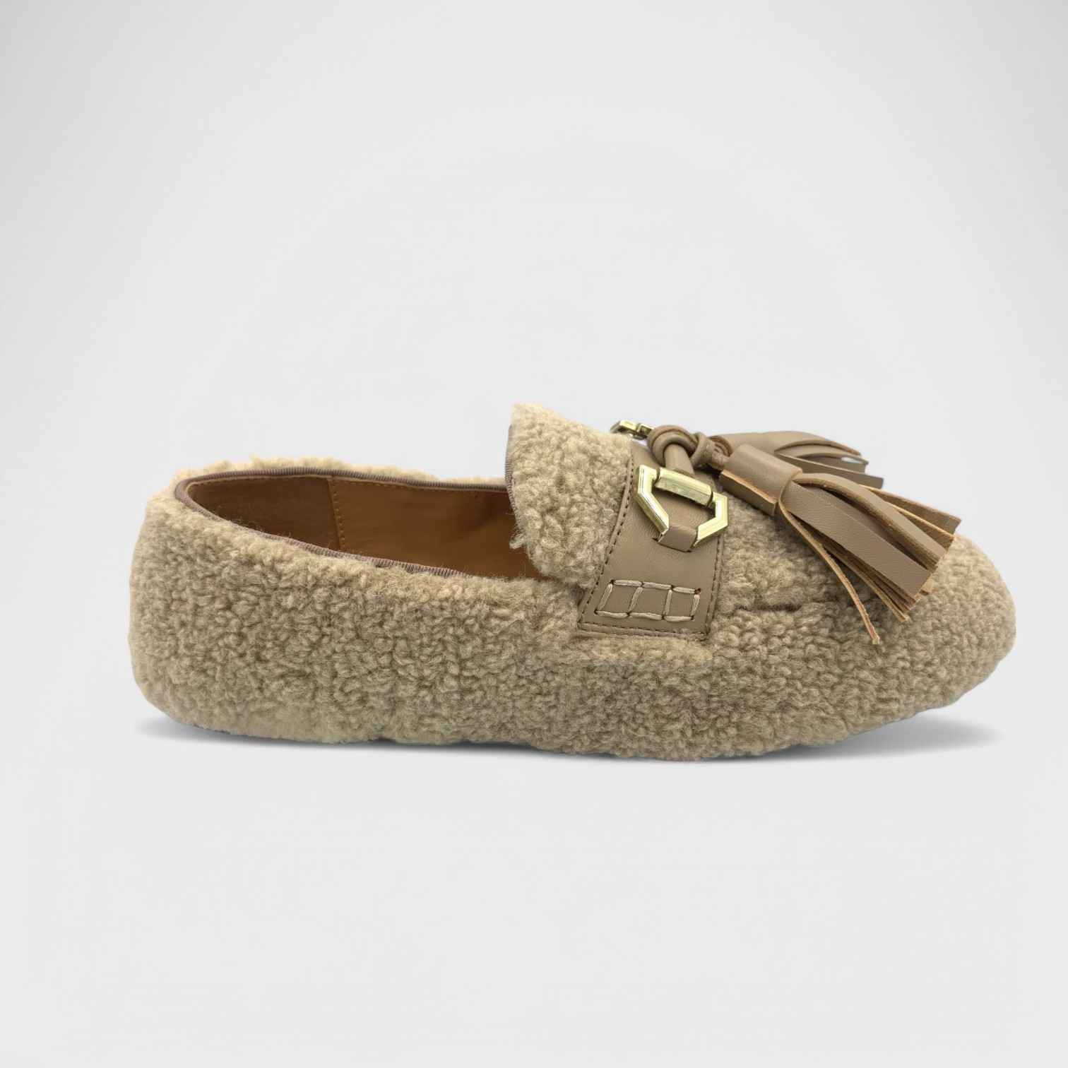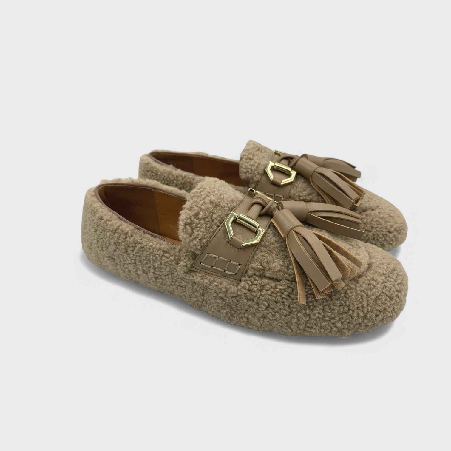 Bolzano Mocasín de textura efecto pelo en tono taupe, con borlas y herraje dorado. Silueta limpia, punta redondeada y peso ligero para llevar a diario. Tacto suave y comodidad desde la primera puesta