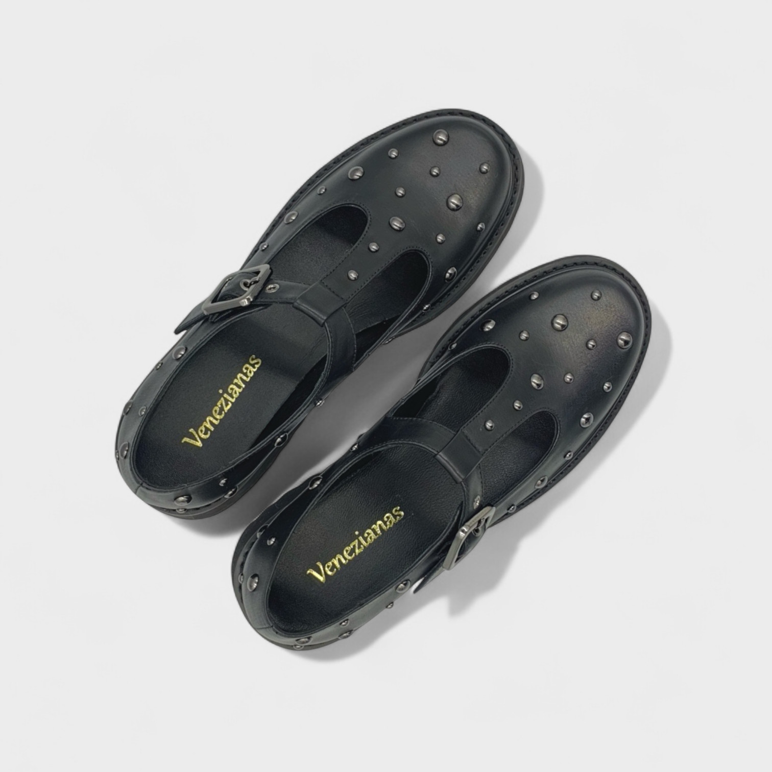Mary Jane de piel negra con tira en T y hebilla ajustable. El corte limpio está cubierto por pequeñas tachuelas metálicas en relieve que aportan carácter sin recargar. Horma de punta redondeada y sujeción estable en el empeine. Interior suave con plantilla acolchada para mayor confort. Suela track de goma, de perfil medio y dibujo dentado, que suma agarre y una pisada ligera sin exceso de peso. Un diseño robusto y cómodo para el día a día, construido para durar.