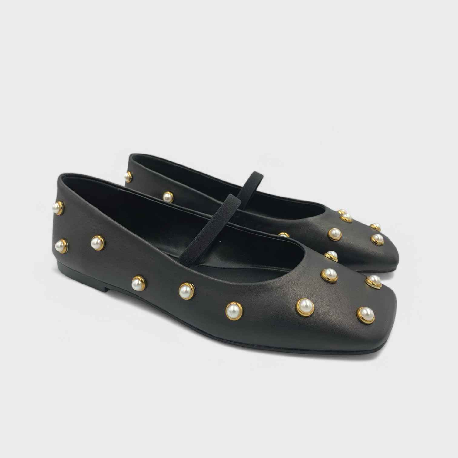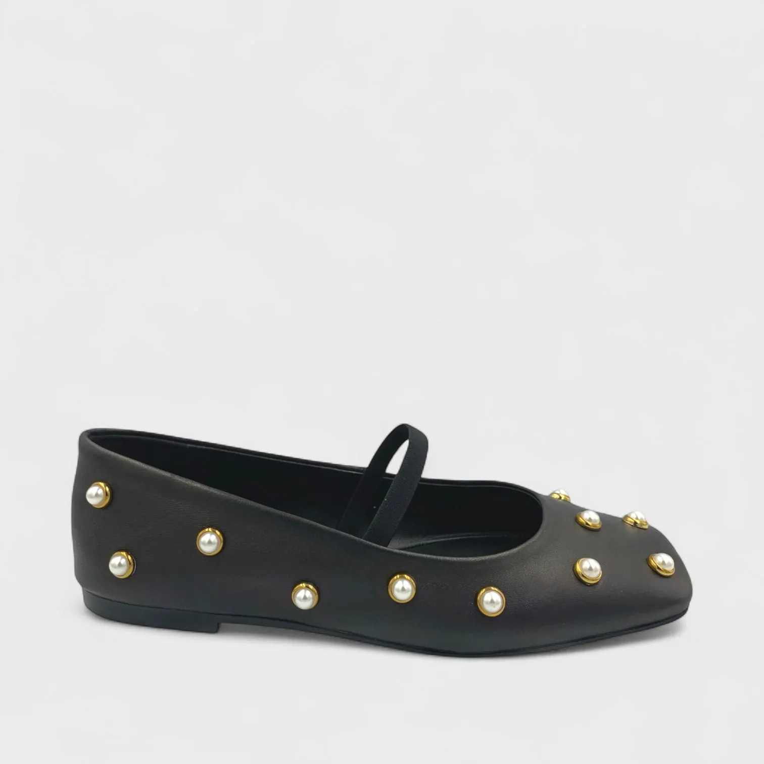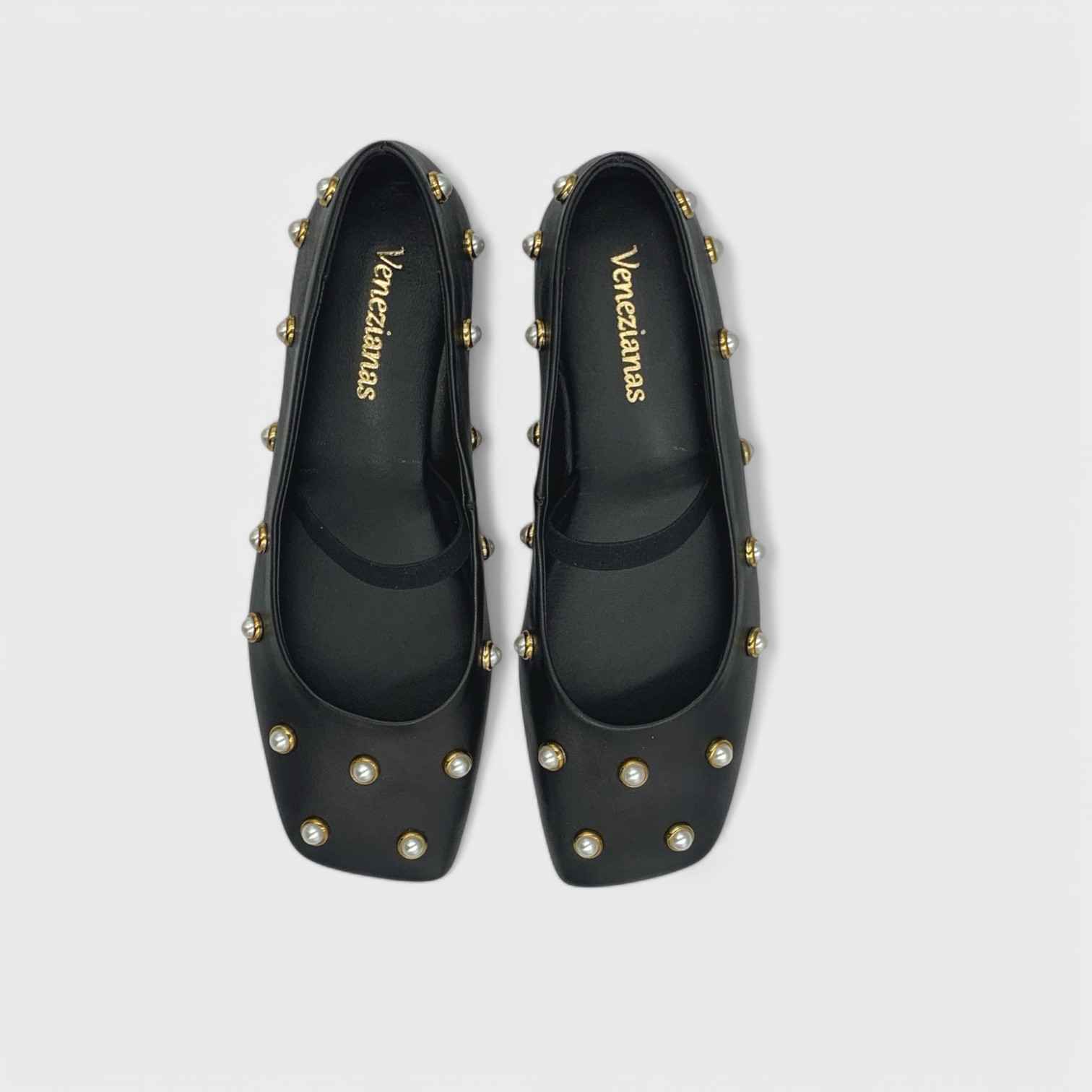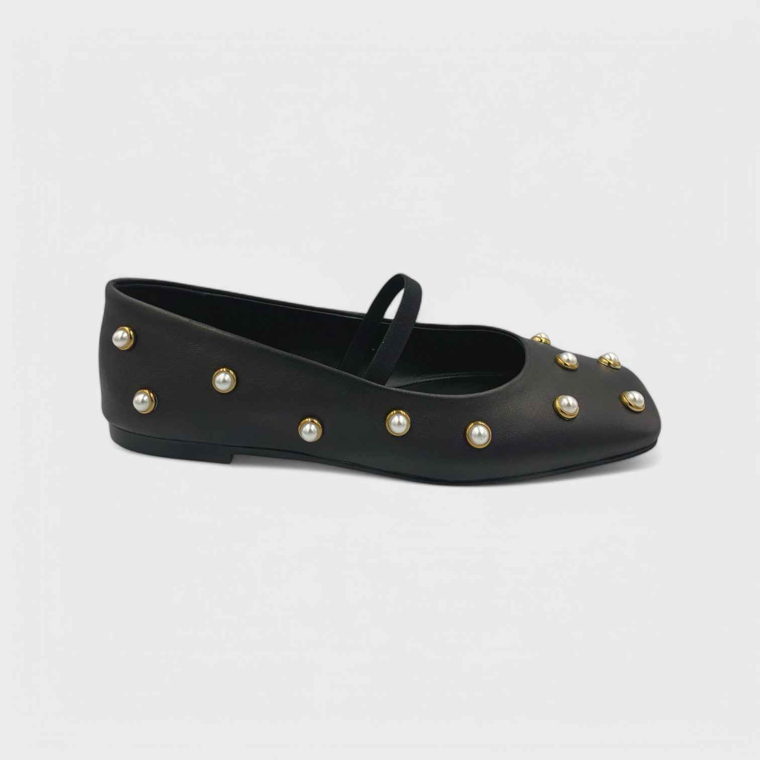 Bailarina Mary Jane de piel de cabra negra con tira elástica y perlas engastadas en dorado repartidas por el upper y los laterales. Punta redondeada, acabado pulido y confort ligero desde la primera puesta