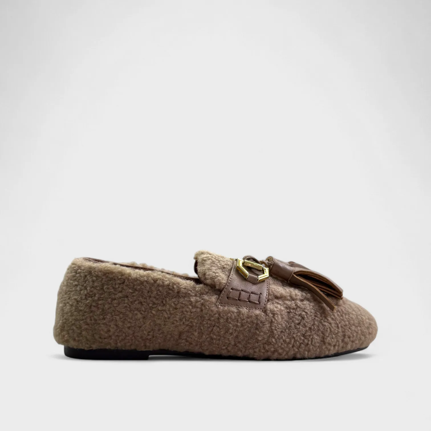 Bolzano Mocasín de textura efecto pelo en tono taupe, con borlas y herraje dorado. Silueta limpia, punta redondeada y peso ligero para llevar a diario. Tacto suave y comodidad desde la primera puesta