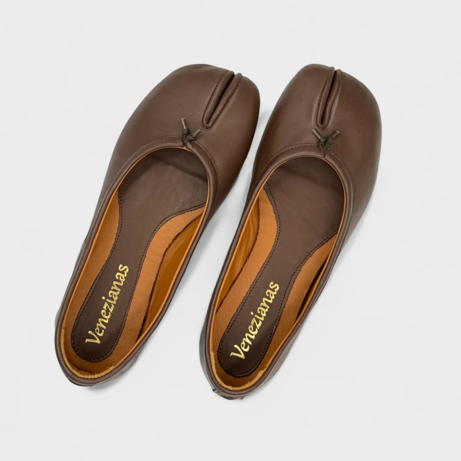 Las Tabi Venezianas Nappa Brown combinan líneas puras y materiales de primera calidad. Su silueta minimalista con punta partida aporta carácter sin perder la esencia femenina y ligera de una bailarina. La piel nappa marrón, flexible y resistente, garantiza confort en cada paso.